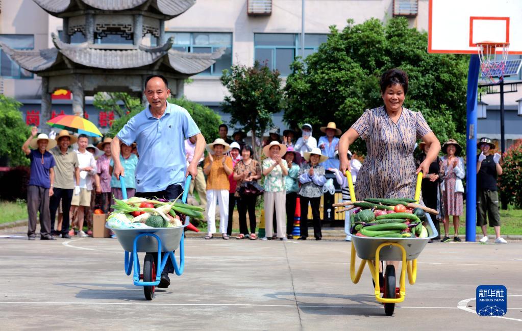 6月21日,在湖州市長興縣和平鎮長崗村,村民在進行獨輪車運蔬菜比賽。