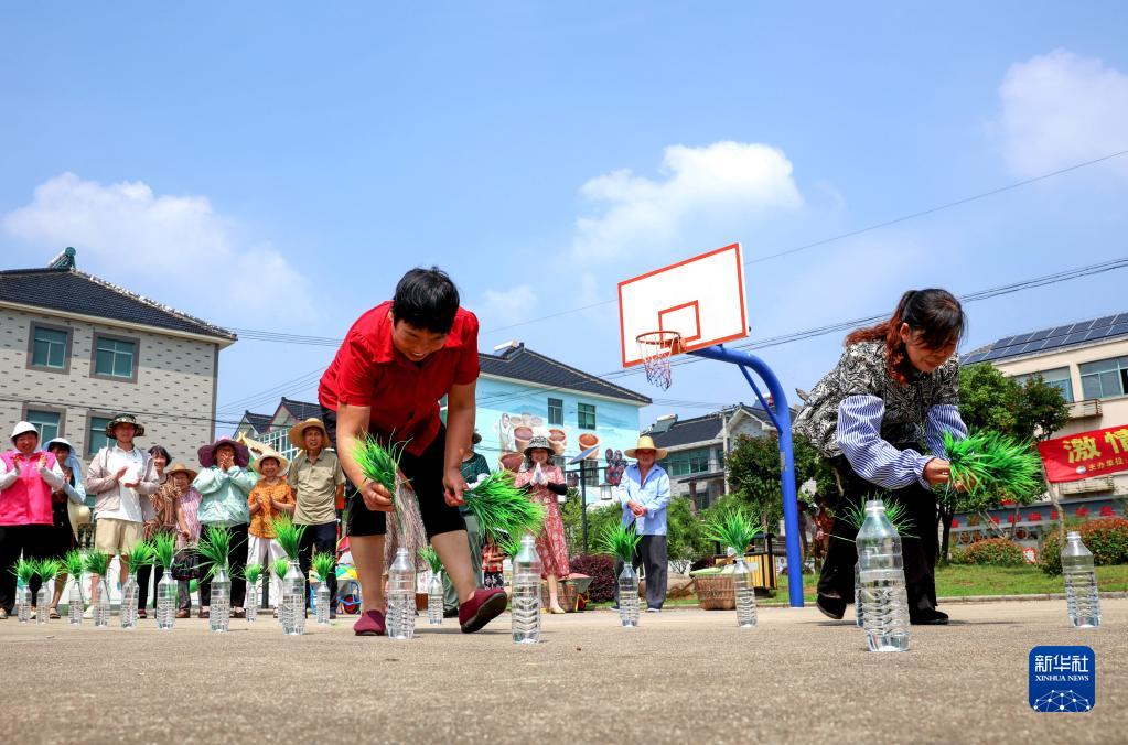 6月21日,在湖州市長興縣和平鎮長崗村,村民在進行瓶口插秧比賽。