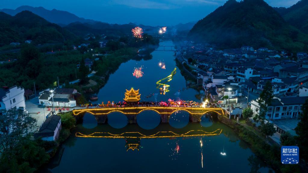 6月16日,在安徽省寧國市胡樂鎮,“魚燈”“河燈”和“龍燈”相互輝映(無人機照片)。