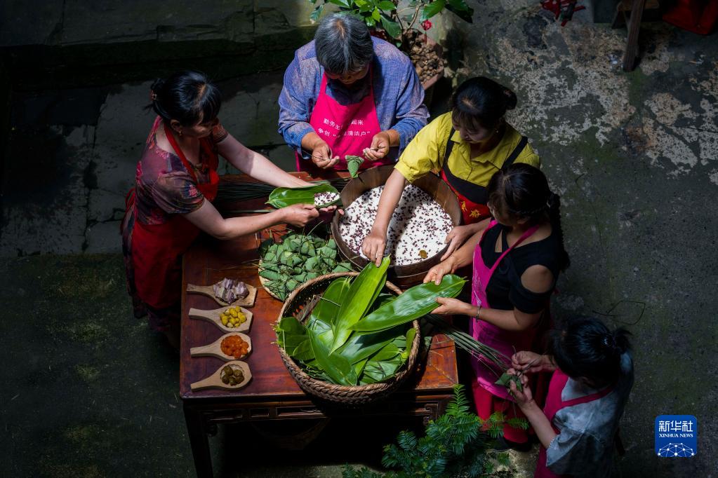 6月17日,安徽省寧國市胡樂鎮村民在包粽子。