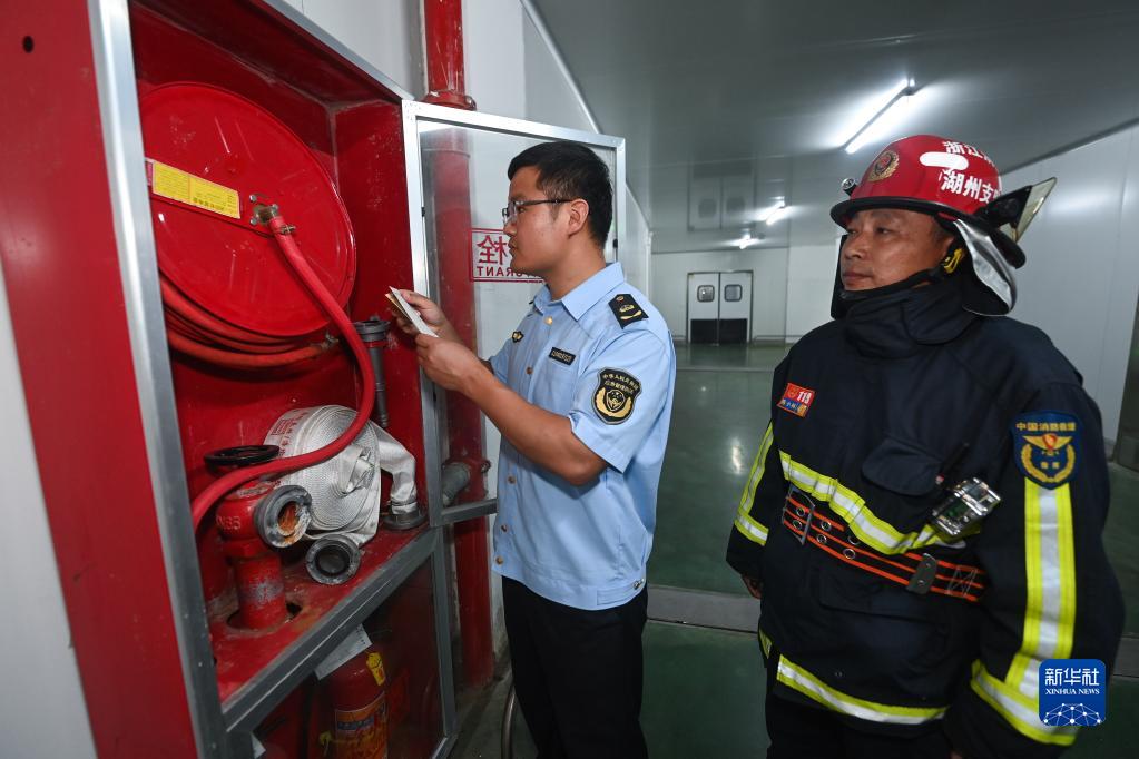 6月21日,道場鄉應急管理執法部門的工作人員(左)和消防部門工作人員對企業消防設施進行檢查。