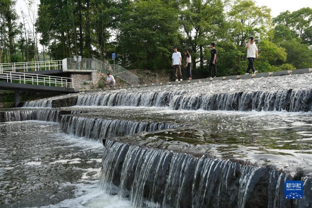 6月21日,人們在埭溪鎮月映橋村的一處碇步橋游玩。