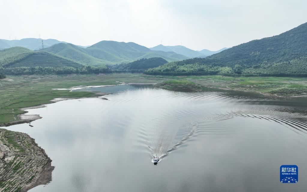 工作人員在埭溪鎮老虎潭水庫開展聯合巡查,維護水源地安全(無人機照片,6月21日攝)。