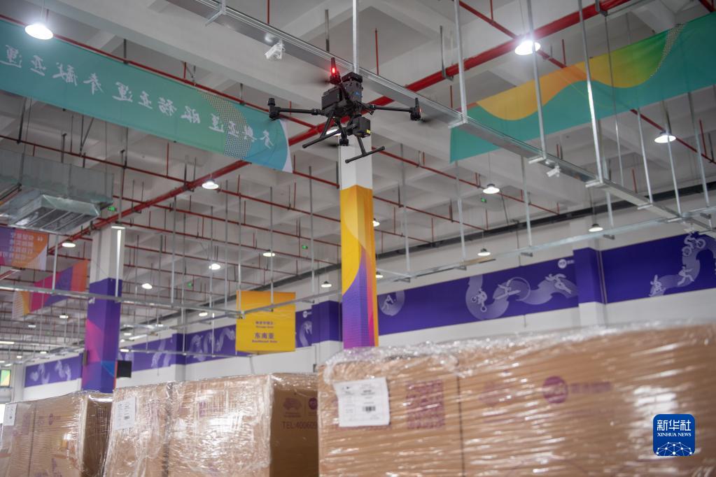 6月21日,工作人員使用無人機對第19屆杭州亞運會物流中心內的包裹進行清點。