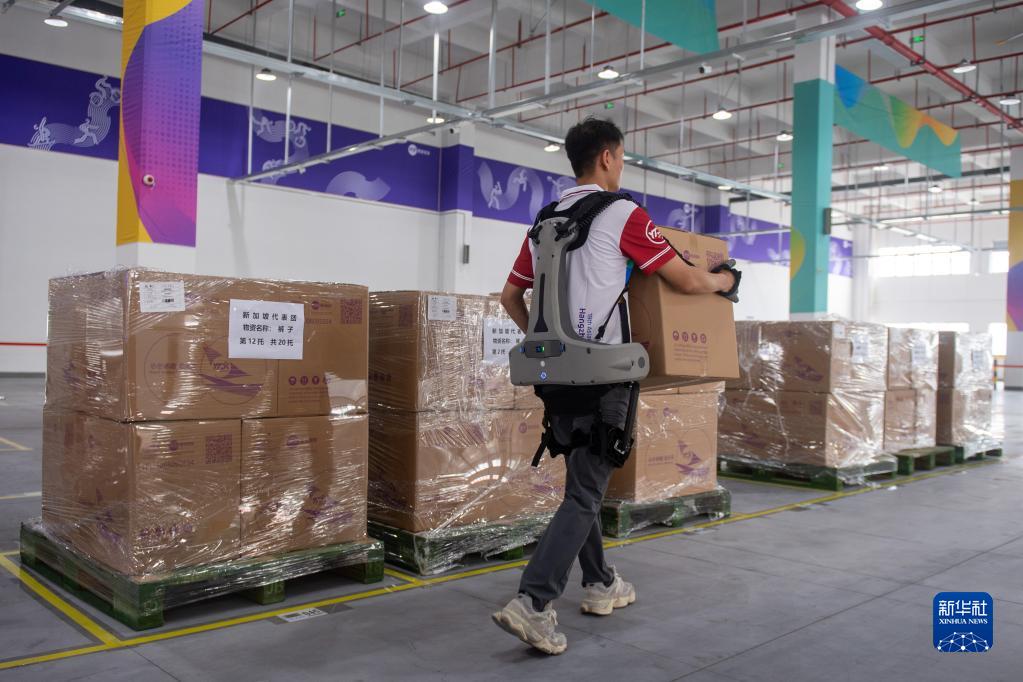 6月21日,杭州亞運會物流中心的工作人員使用外骨骼機器人輔助搬運包裹。