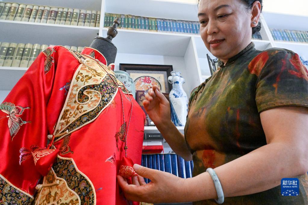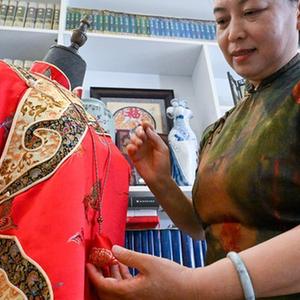 陳玉秋將做好的香囊掛在滿族旗袍上裝飾點綴(6月20日攝)。
