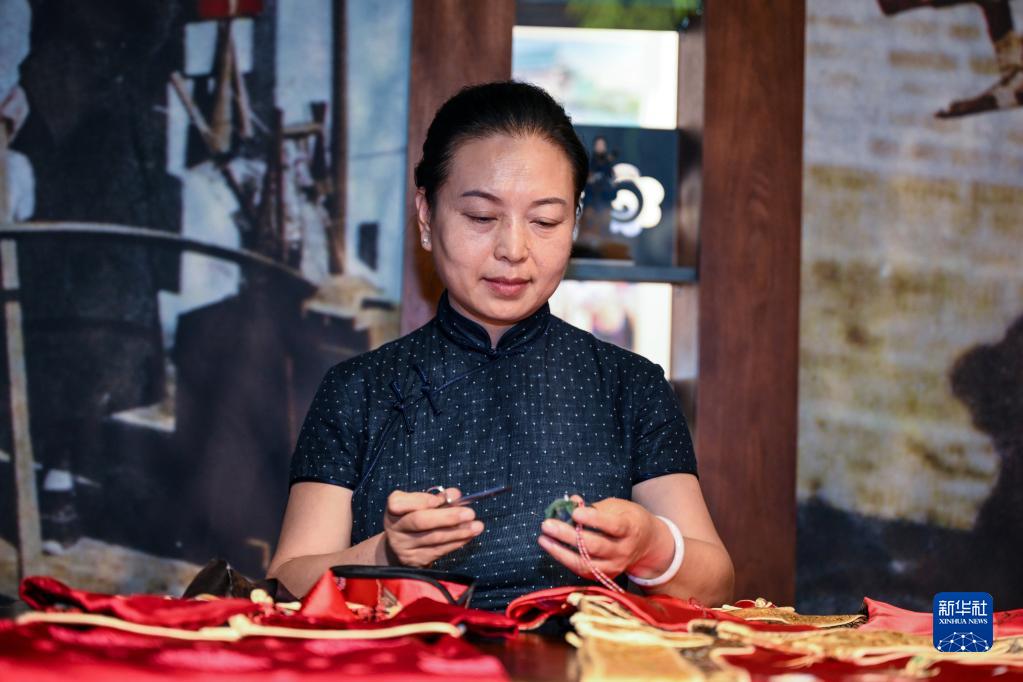 陳玉秋在吉林市博物館制作端午節香囊(6月19日攝)。