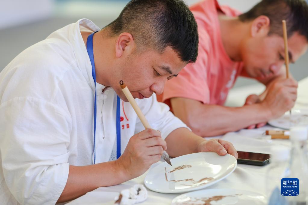 6月21日,參展商在喀什國際會展中心展示瓷畫創作過程。