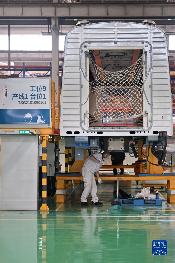 工作人員在天津中車唐車軌道車輛有限公司的組裝車間內檢查車底(6月20日攝)。