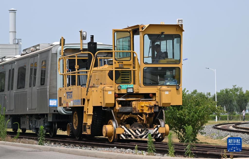 在天津中車唐車軌道車輛有限公司,工作人員駕駛機車將組裝好的車體拉往調試車間(6月20日攝)。