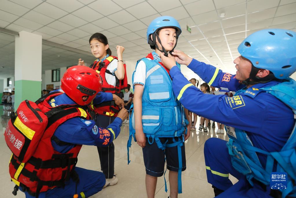 6月21日,即墨區藍天救援隊的志愿者指導即墨區潮海第四小學的學生正確穿戴救援裝備。