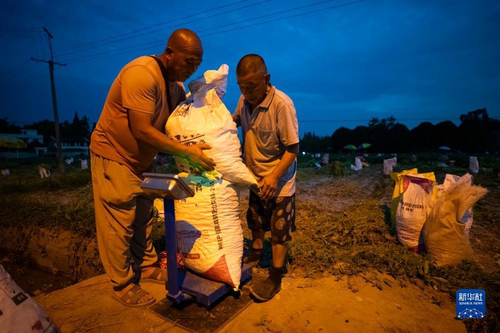 6月19日夜間,在四川省成都市金堂縣官倉街道雙堰社區,種植大戶易大槍(左)在稱量收獲的毛豆。