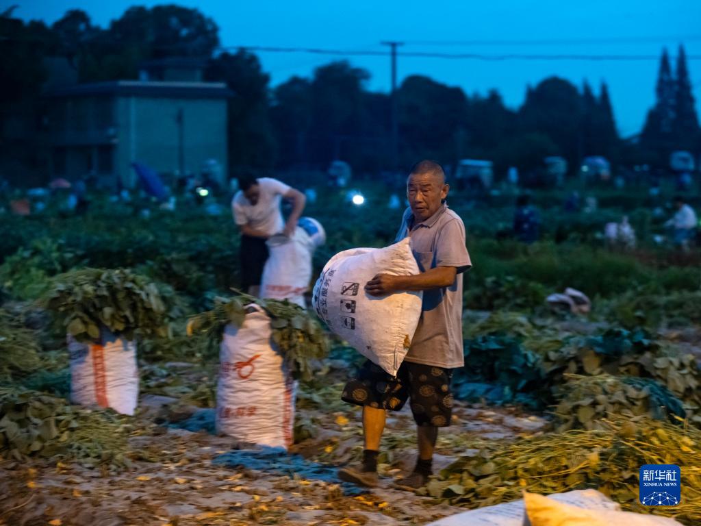 6月19日夜間,在四川省成都市金堂縣官倉街道雙堰社區,農民將剛采收的毛豆裝袋過秤,準備運走。