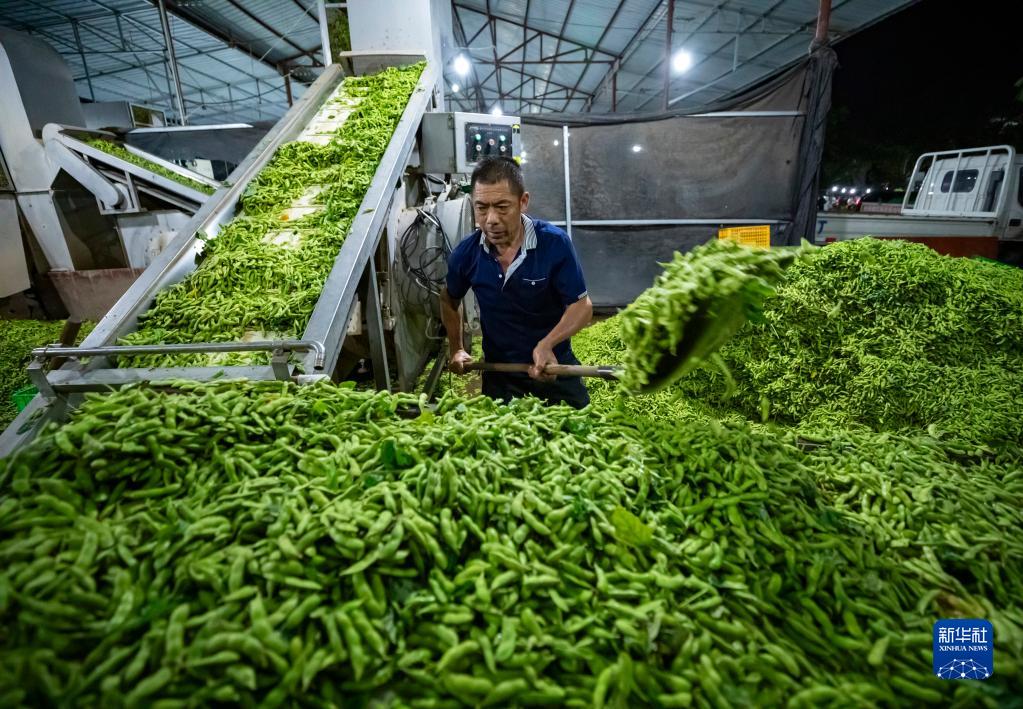 6月19日夜間,在四川省成都市金堂縣官倉綜合(果蔬)市場,工人將運來的新鮮毛豆裝上清洗、挑選流水線。