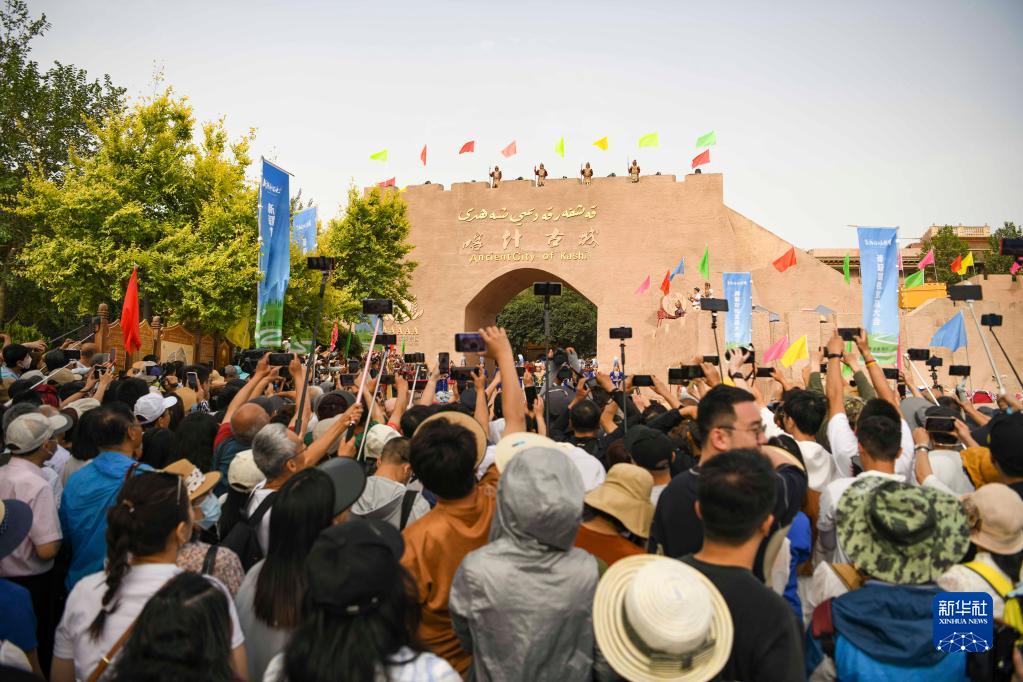 游客在新疆喀什古城景區東門觀看開城儀式表演(6月13日攝)。新華社記者 胡虎虎 攝