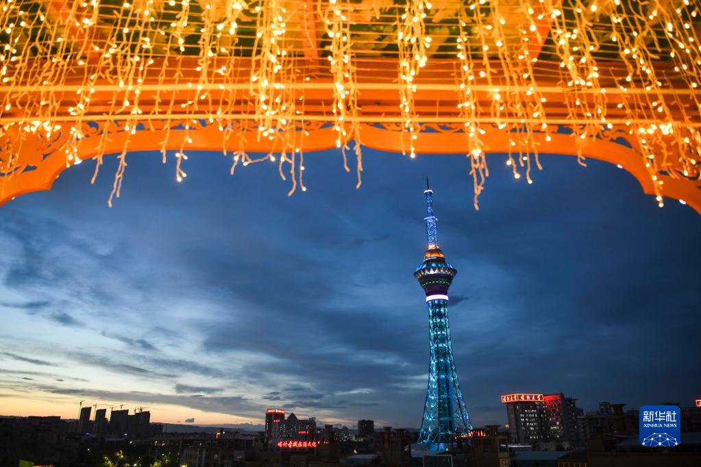 這是在新疆喀什古城景區城墻上拍攝的昆侖塔夜景(6月14日攝)。新華社記者 胡虎虎 攝