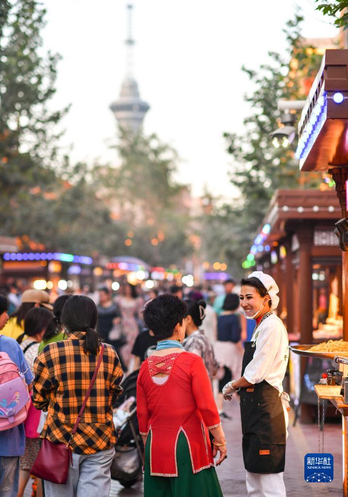在新疆喀什古城景區汗巴扎夜市,一名攤主與游客聊天(6月16日攝)。新華社記者 胡虎虎 攝
