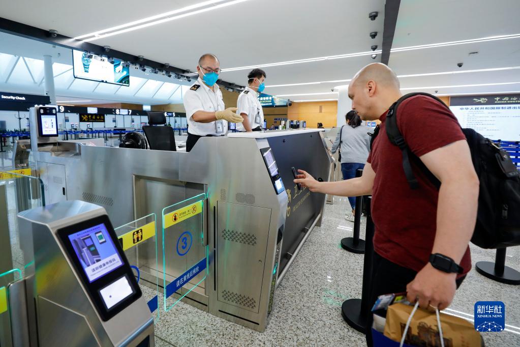 6月21日,在成都天府國際機場,成都海關關員(左)指導一名外國旅客刷健康申報碼通過多功能一體化智能閘機。