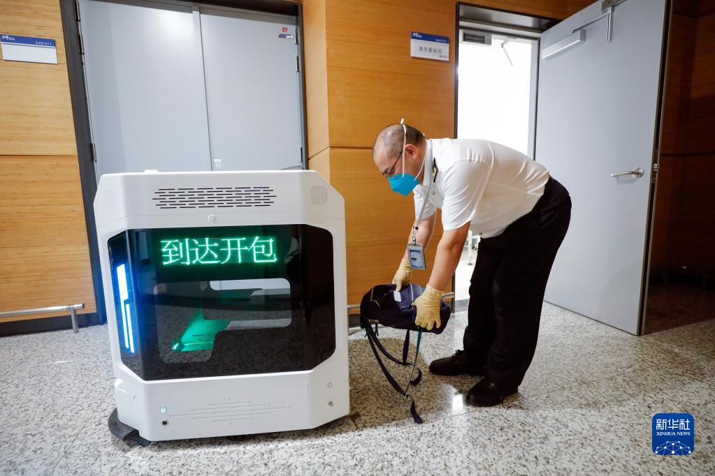6月21日,在成都天府國際機場,成都海關關員從手提行李智能攜運機器人中取出異常行李,準備開包檢查。