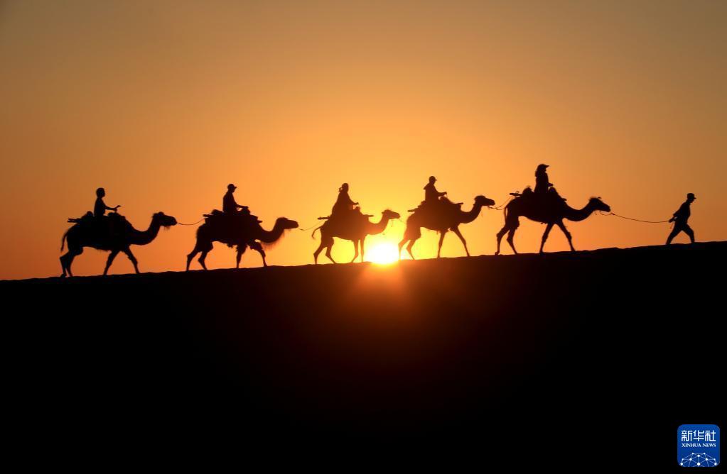 游客騎著駱駝在敦煌鳴沙山月牙泉景區游覽(6月7日攝)。