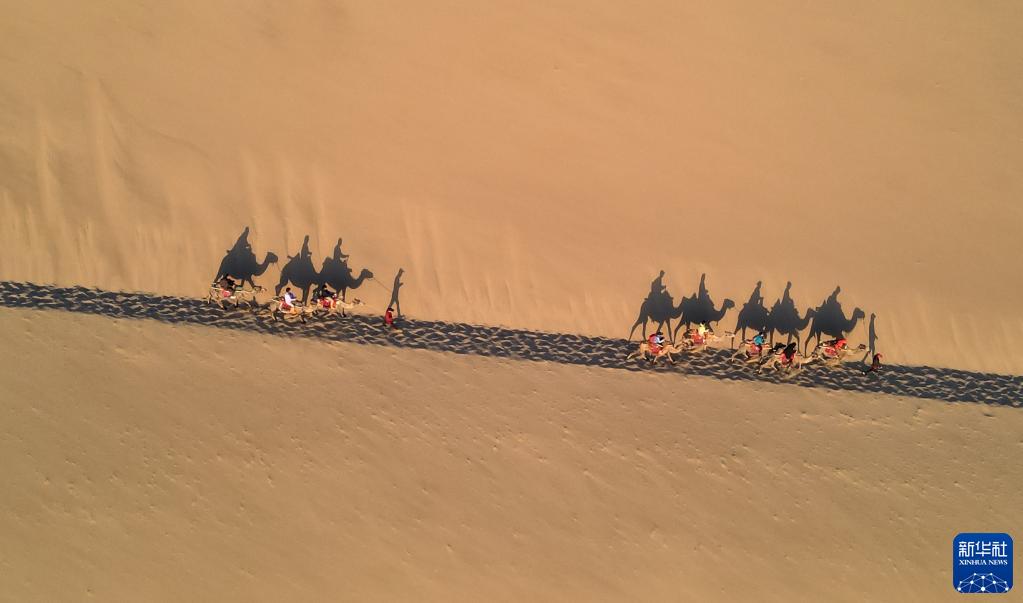 游客騎著駱駝在敦煌鳴沙山月牙泉景區游覽(6月7日攝,無人機照片)。