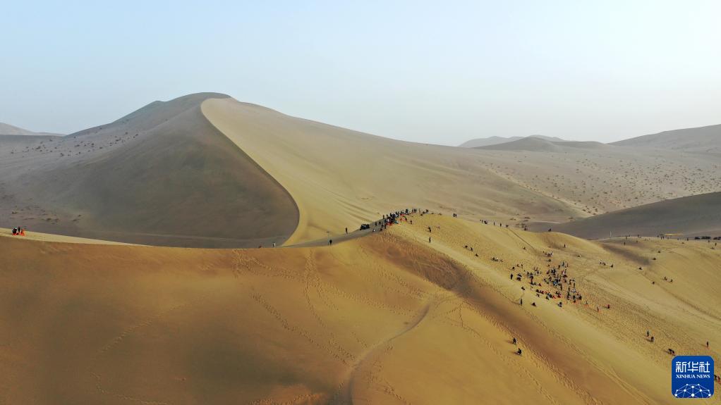 游客在敦煌鳴沙山上游玩(4月24日攝)。