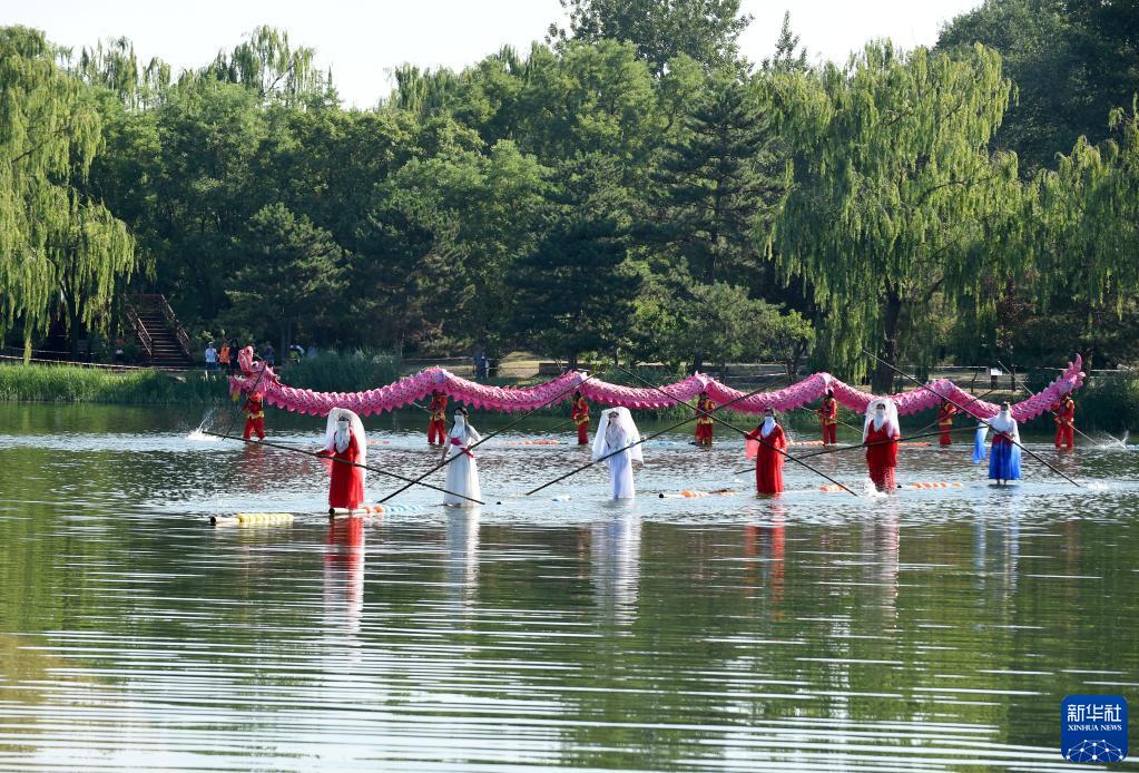 6月22日,獨竹漂表演者在北京圓明園九州景區的后湖進行水上表演。