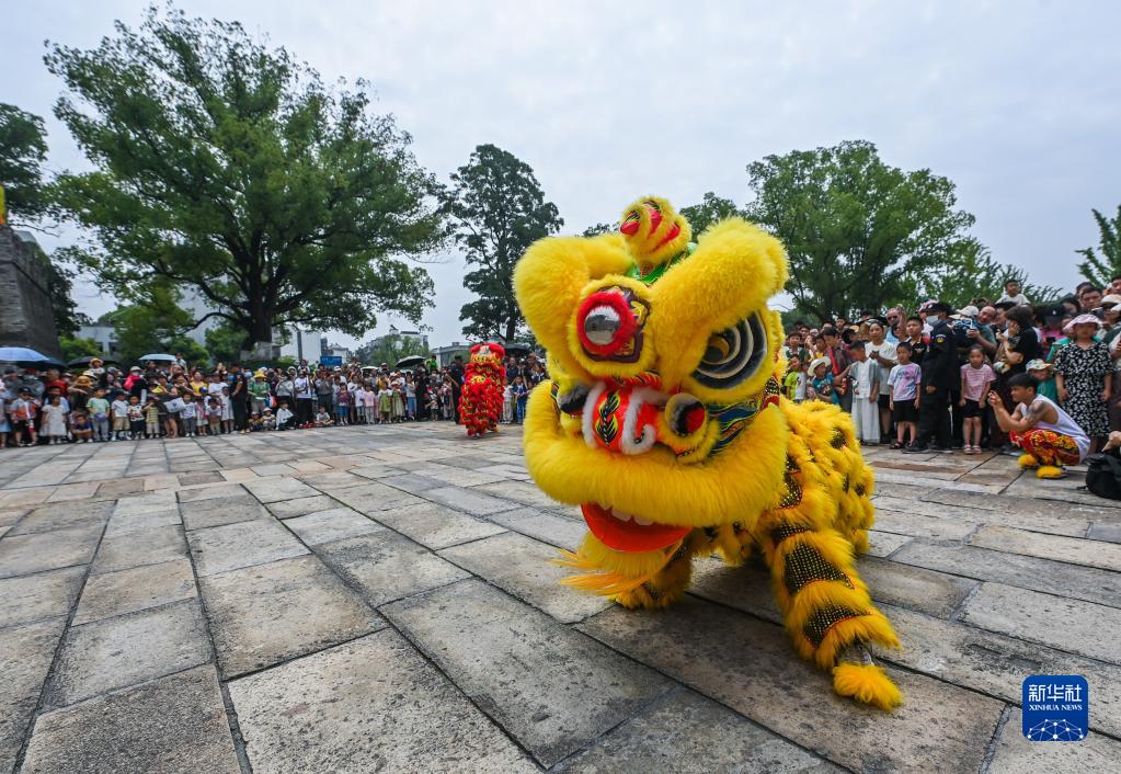 這是6月22日在浙江嘉興子城遺址公園廣場拍攝的舞獅表演。