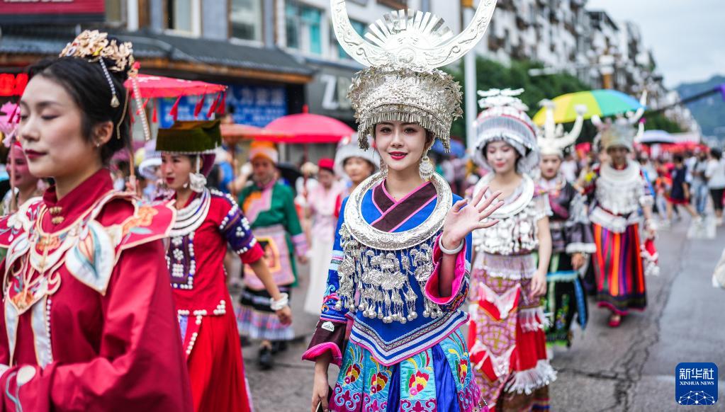 6月22日,在貴州省黔東南苗族侗族自治州施秉縣舉行的獨木龍舟節上,少數民族同胞身著盛裝進行巡游。