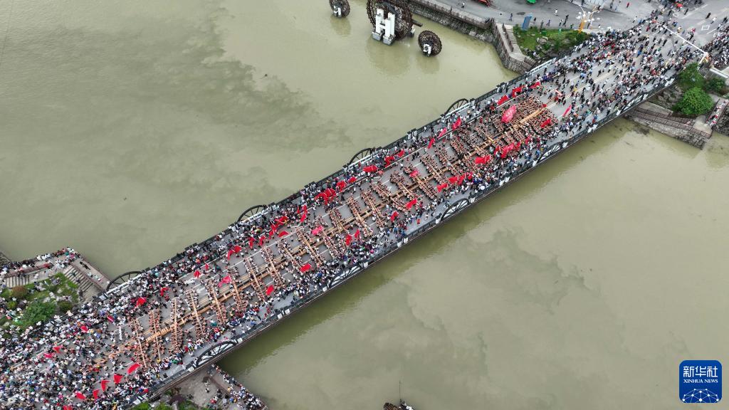 6月22日,在貴州省黔東南苗族侗族自治州施秉縣舉行的獨木龍舟節上,人們參與獨木龍舟巡游活動(無人機照片)。