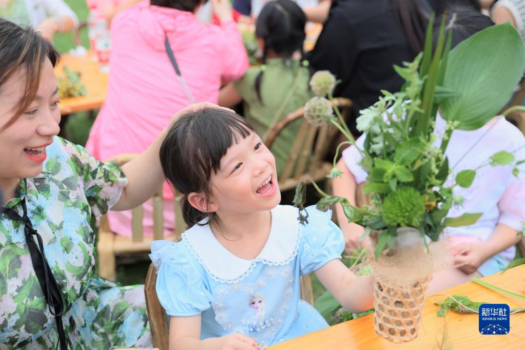 6月22日,小朋友在上海市閔行區華漕鎮舉行的端午活動上展示制作好的艾草小提籃。