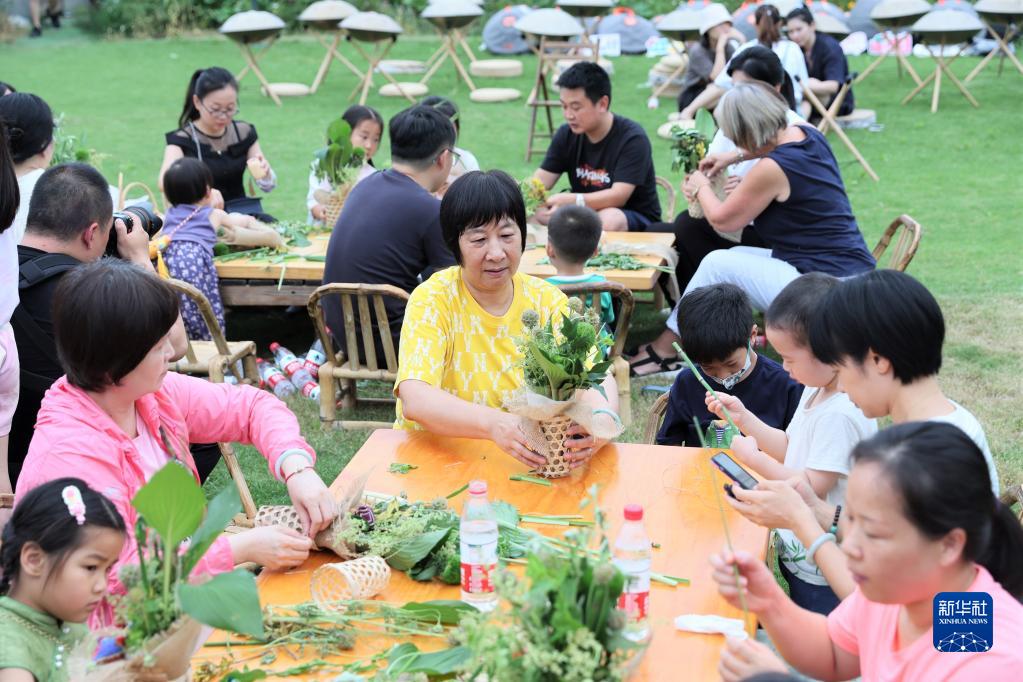 6月22日,人們在上海市閔行區華漕鎮舉行的端午活動上制作艾草小提籃。