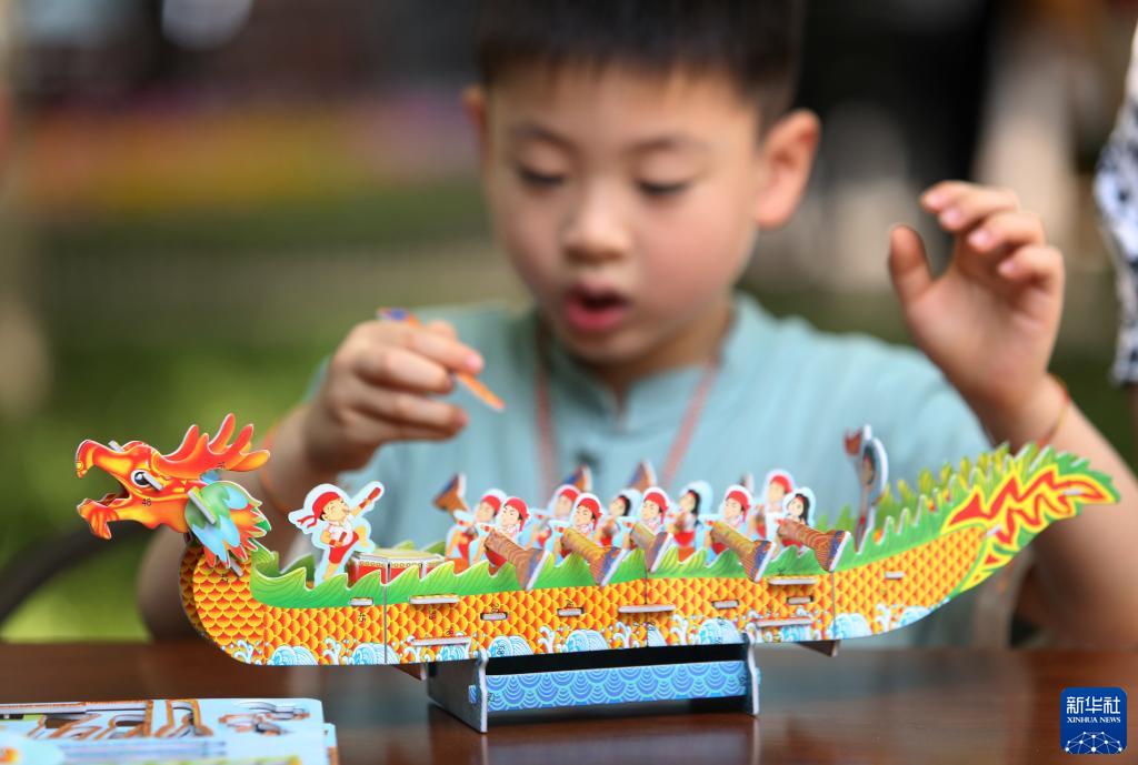 6月22日,小朋友在陜西省渭南市博物館端午活動上拼龍舟。