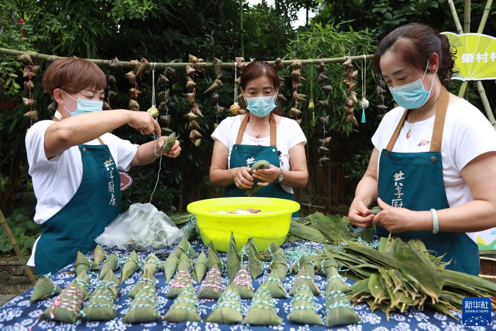 6月22日,浙江省杭州市臨安區天目山鎮月亮橋村的村民在包粽子。
