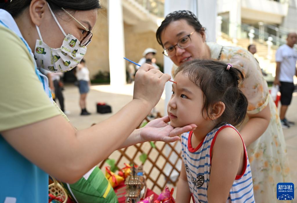 6月22日,海南省博物館的工作人員給孩子“點雄黃”。