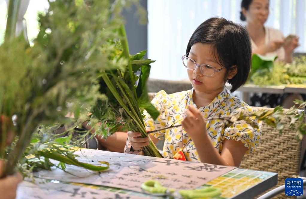 6月22日,小朋友在海南省博物館學習制作艾草門掛。