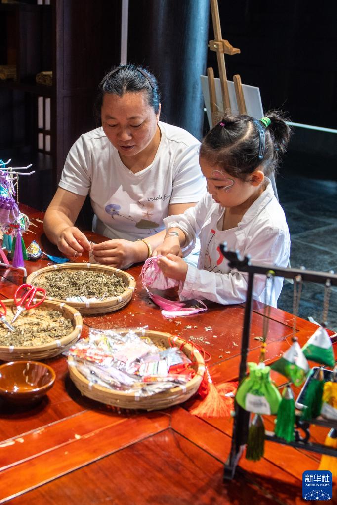 6月22日,游客在湖南省岳陽市汨羅市屈子祠鎮屈子文化園制作香囊。