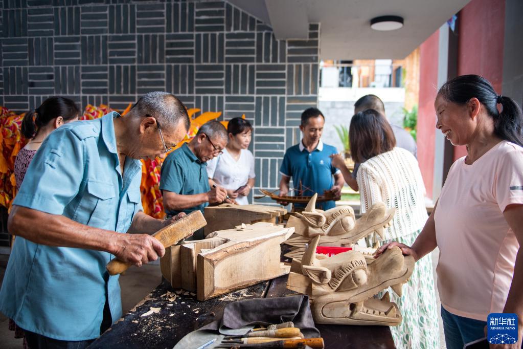 6月22日,手藝人在湖南省岳陽市汨羅市屈子祠鎮新義村向游客展示雕龍頭技藝。