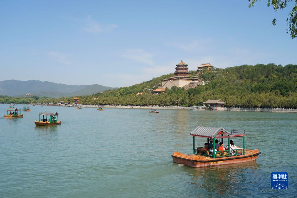 6月22日,游人在北京頤和園乘坐游船。