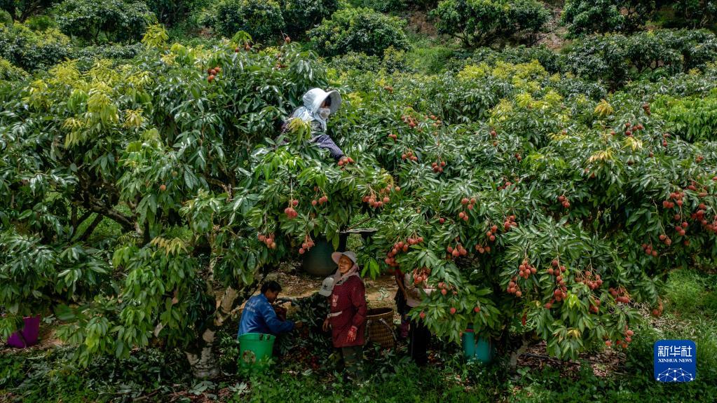 果農在云南省屏邊縣灣塘鄉米坡荔枝基地采摘荔枝(6月21日攝,無人機照片)。