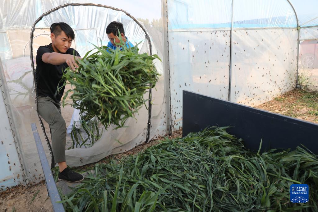 6月21日,山東省樂陵市西段鄉岔河村東亞飛蝗養殖基地的養殖戶用玉米草喂螞蚱。