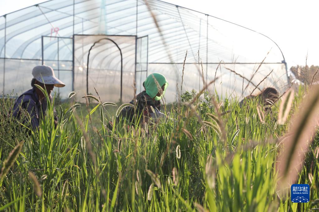 6月21日,山東省樂陵市西段鄉岔河村東亞飛蝗養殖基地的螞蚱養殖戶在割草。