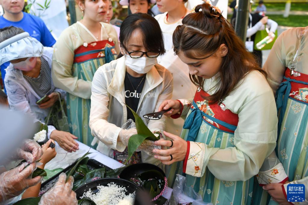 6月22日,來自法國的15歲女孩李歐諾(前右)在北京龍潭湖公園體驗包粽子。