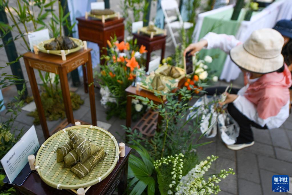 6月22日,游客在北京龍潭湖公園觀看展出的各類粽子。