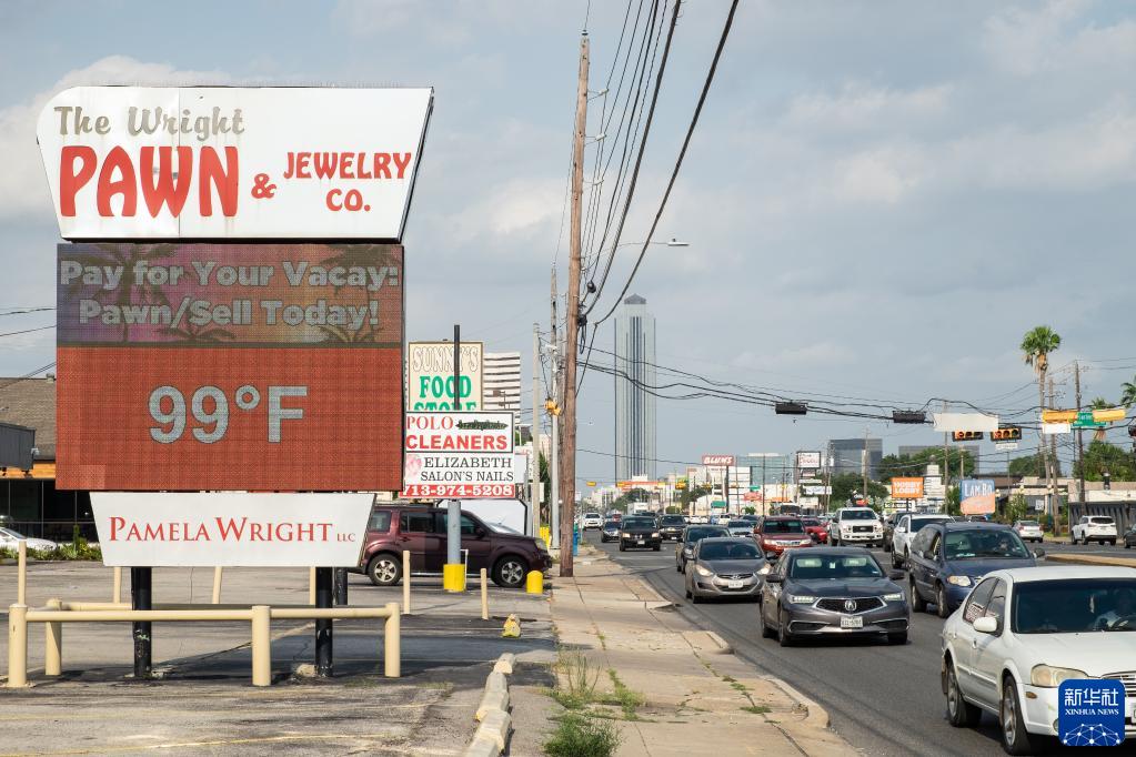 6月21日,美國得克薩斯州休斯敦市一個溫度指示牌顯示氣溫達到99華氏度(約37.2攝氏度)。
