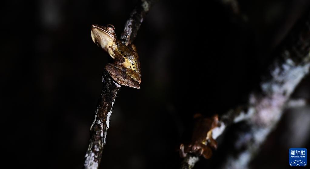 在海南熱帶雨林國家公園吊羅山片區,無聲囊泛樹蛙在樹上休息(6月13日攝)。