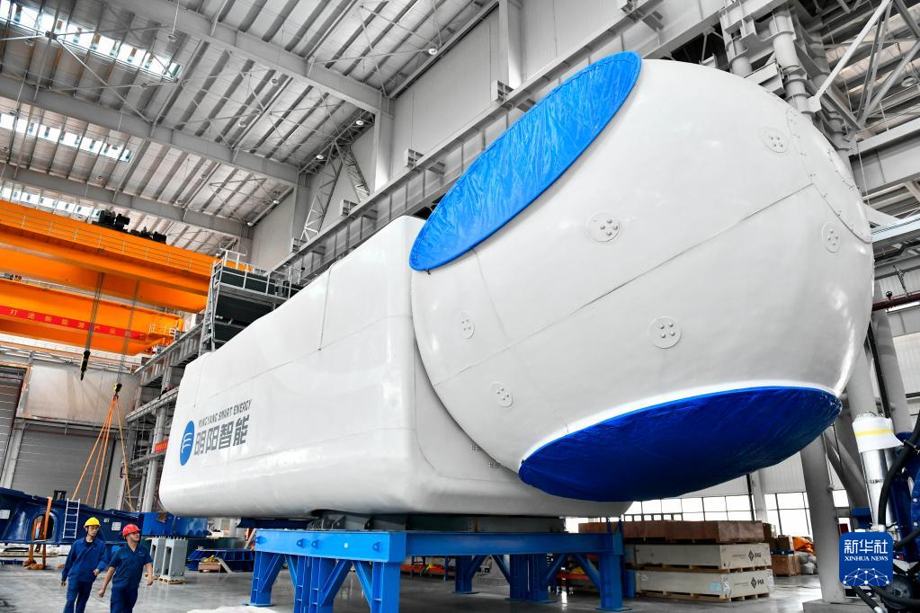 6月21日,在明陽北方(乳山)高端海洋裝備智能制造產業基地,工作人員從首臺下線的10兆瓦級風機前經過。