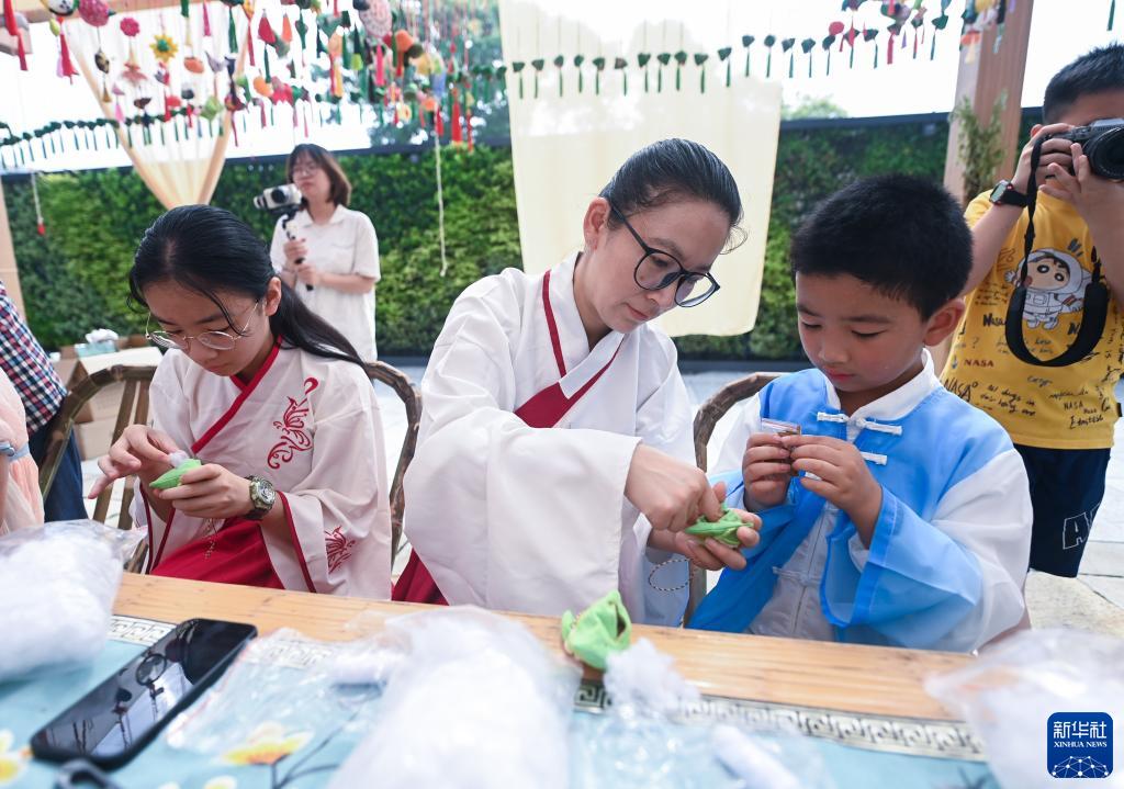 6月22日,孩子們在嘉興端午民俗文化節的端陽大集上學習做香囊。