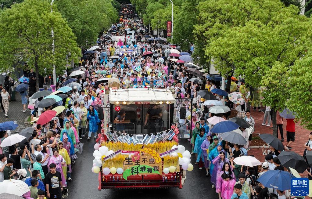 當日,為迎接畢業季,華中農業大學舉行了一場花車巡游,學生們簇擁著由現代農機裝備組成的花車隊伍,在校園里巡游,慶祝畢業、致敬青春。