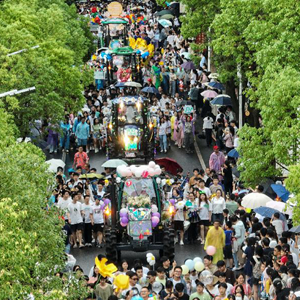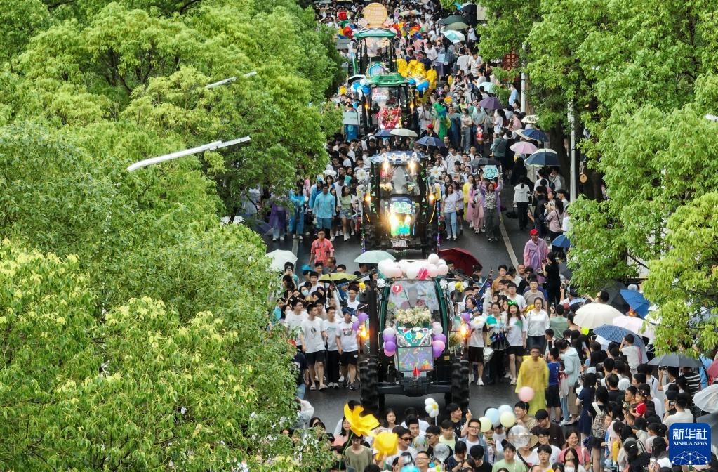 當日,為迎接畢業季,華中農業大學舉行了一場花車巡游,學生們簇擁著由現代農機裝備組成的花車隊伍,在校園里巡游,慶祝畢業、致敬青春。
